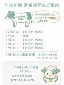 【年末年始の営業時間について】MouMouCafe金山/モウモウカフェ金山/年末年始の営業時間/2025→→2026